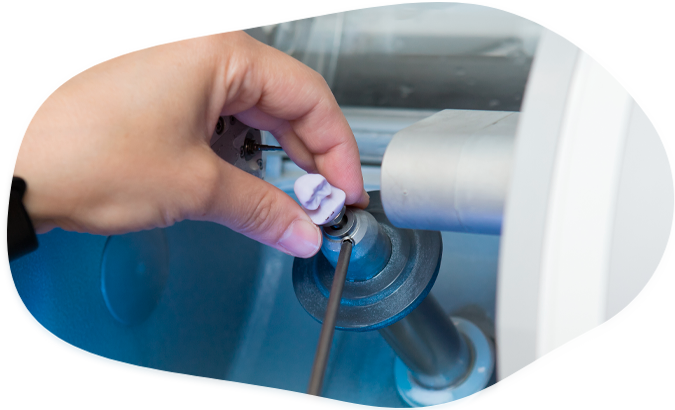 Nach der digitalen Aufnahme der Zahnsituation konstruieren wir den Zahnersatz am Computerbildschirm. Sie können dabei zusehen, wie wir die Passform und das Design Ihres neuen Zahnes gestalten. Diese Daten senden wir an eine in der Praxis stehende, hochmoderne Schleifeinheit. Aus einem industriell gefertigten Keramikblock, der höchsten Qualitätsstandards entspricht und Ihrer Zahnfarbe entspricht, fräst die Maschine innerhalb weniger Minuten das passgenaue Werkstück heraus.